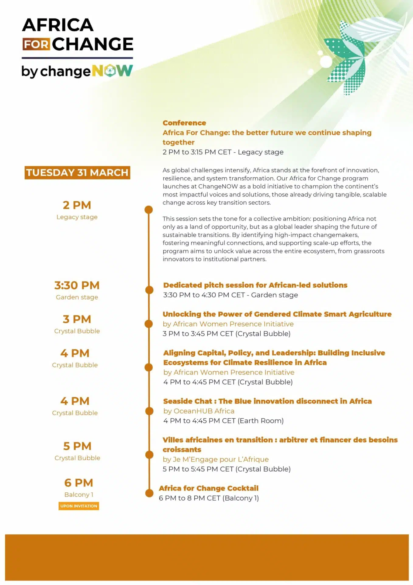 Africa for Change est l'évolution de l'Africa Day, qui s'est déroulé lors des éditions 2024 et 2025. Plus de 10 délégations ont participé à ces événements, et ce nombre devrait augmenter lors des prochaines éditions.